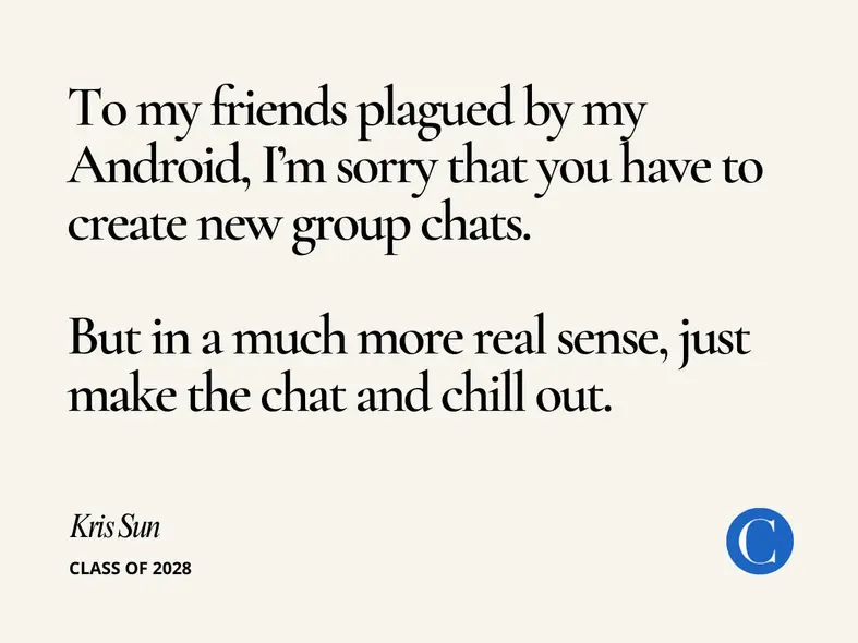 بله، می‌توانم نالهٔ قضاوت‌آمیز شما را بشنوم؛ من هم در حال نفس‌کشیدن هستم. اگرچه سامسونگ گلکسی S25 من با کیفیت بی‌نظیر و ۲۵۶ گیگابایت فضای شگفت‌انگیز دارد، احساس می‌کنم در جنگ سردی میان کاربران میهن‌پرست آی‌فون و اندرویدکارهای ایدئولوژیکاً نادرست، همدردی با دشمن دارم. همچنین حس می‌کنم جمعیت دانشجویی دوک، چه آگاه باشد چه نه، به‌تدریج ما کاربران اندروید را منزوی کرده است.