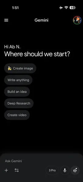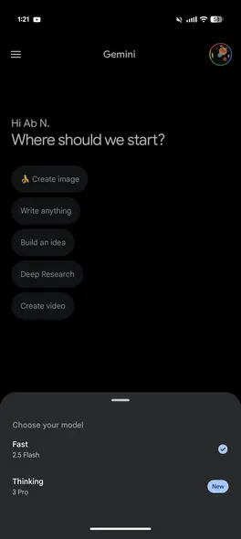 در اندروید و iOS امروز، جعبهٔ ورودی Gemini طبیعتاً باریکتر است؛ بنابراین بهصورت «3 Pro» و «2.5 Flash» (مانند قبل) نمایش میدهد، اگرچه «سریع» و «تفکر» در پایین صفحه نیز دیده میشوند.