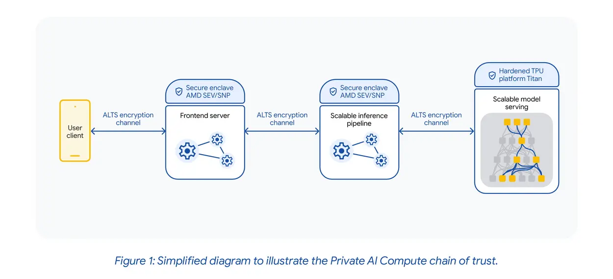 بهطور خاص، این یک «فضای امن و مستحکم برای پردازش» دادههای حساس کاربر است که گوگل نمیتواند به آن دسترسی داشته باشد. این سیستم از استک کامل هوش مصنوعی گوگل، شامل پردازندهها (CPU) و پردازندههای ابر (TPU) بهره میگیرد. تلفن شما از طریق رمزگذاری و تصدیق از راهدور به «محیط ابری بسته با امنیت سختافزاری» متصل میشود.
