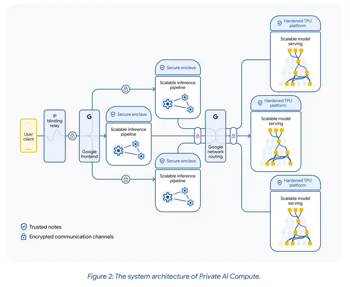 گوگل جزئیات فنی بیشتری را در اینجا منتشر کرده است. این مفهوم شبیه به «محاسبه ابری خصوصی» (Private Cloud Compute) در سرویس Apple Intelligence میباشد.