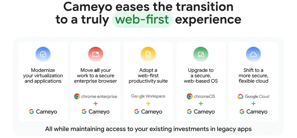 سال‌ها، اصلی‌ترین مانع برای پذیرش عمیق‌تر ChromeOS در سازمان‌ها «فاصله برنامه‌ای» بوده است — نیاز مداوم به دسترسی به تعداد کمی از برنامه‌های ویندوزی باقی‌مانده در یک سازمان. Cameyo این مانع را به‌صورت کامل رفع می‌کند و به سازمان‌ها امکان می‌دهد به‌اطمینان کل ناوگان خود را به ChromeOS منتقل کنند؛ تنها سیستم‌عاملی که تا به امروز هیچ حملهٔ باج‌افزاری گزارش‌شده‌ای نداشته است.