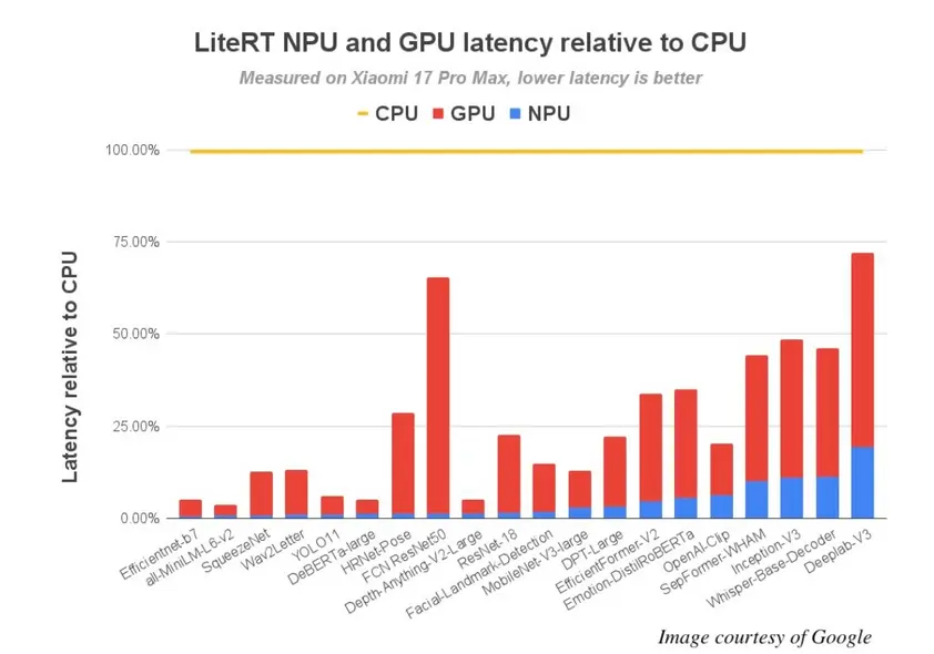 با این حال، امروزه بسیاری از دستگاه‌های موبایل شامل واحدهای پردازش عصبی (NPU) هستند که شتابدهنده‌های هوش مصنوعی سفارشی‌طراحی‌شده‌اند و می‌توانند نسبت به GPU بارهای کاری هوش مصنوعی را به‌ طور قابل‌توجهی تسریع کنند، در حالی که مصرف انرژی کمتری دارند.
