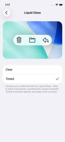 همانطور که در نسخهٔ بتای iOS 26.1 به تصویر کشیده شد، با این سوئیچ کاربران میتوانند بین دو گزینهٔ Liquid Glass جابهجا شوند. یکی طراحی شفاف فعلی است، در حالی که گزینهٔ دیگر ظاهری یخیتر دارد که شفافیت و کنتراست را افزایش میدهد.