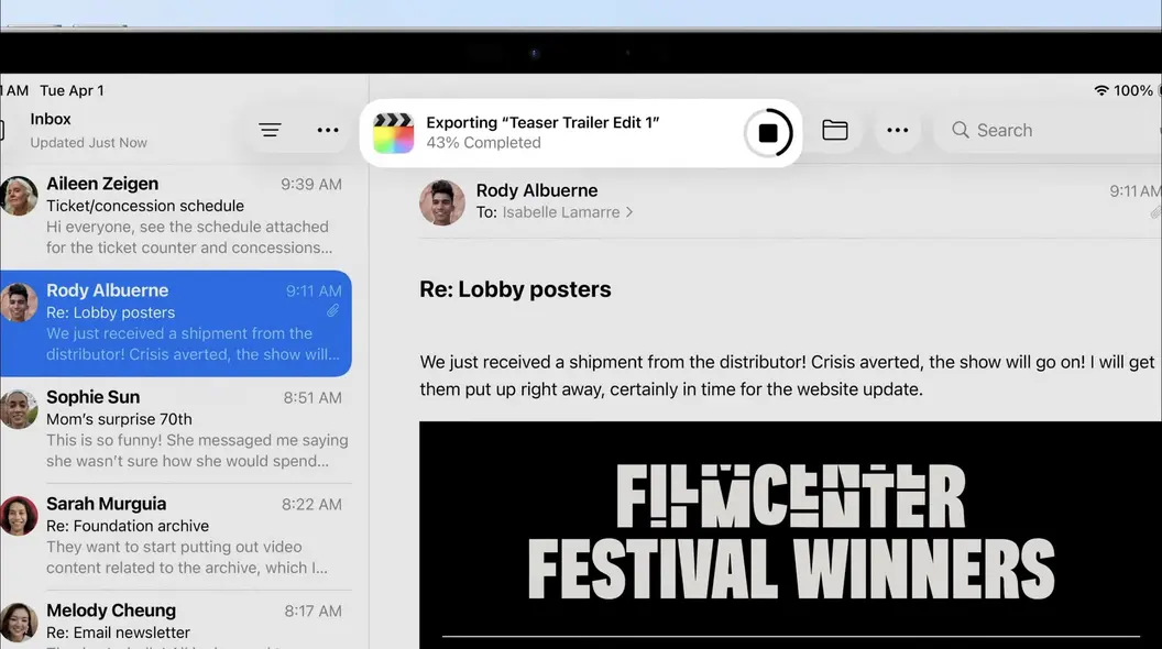 iPadOS 26 استفادهای محدودتر از Live Activities دارد، اما Background Tasks بهویژه برای حرفهایهایی که کارهای سنگین مانند خروجیگیری ویدئو انجام میدهند، بسیار مفید خواهد بود. با کمک Live Activities میتوانید پیشرفت یک خروجیگیری طولانی را بدون اینکه نیاز به نگهداشتن برنامه روی صفحه نمایش داشته باشید، ردیابی کنید.