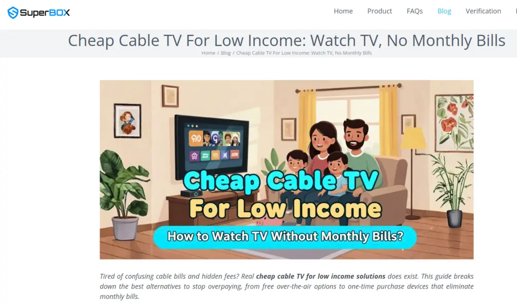«از قبضهای پیچیده کابل و هزینههای پنهان خستهاید؟» وبسایت Superbox در یک پست وبلاگی اخیر با عنوان «تلویزیون کابل ارزان برای افراد کمدرآمد: تماشای تلویزیون، بدون قبوض ماهانه» میپرسد.