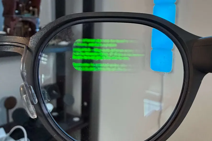 پس اگر این عینکها دوربین، بلندگو یا نشانگرهای نوری ندارند، چه چیزی آنها را هوشمند میکند؟ نمایش است. هر لنز دارای یک نمایشگر است که میتواند از اعلانهای ساده تا تلپروامپتر، ترجمهٔ زنده تا اطلاعات بورس را ارائه دهد. نمایشگر در این فونت سبز به سبک ماتریسی در تمام سیستم وجود دارد. پس هیچ رنگی جز سبز وجود ندارد.