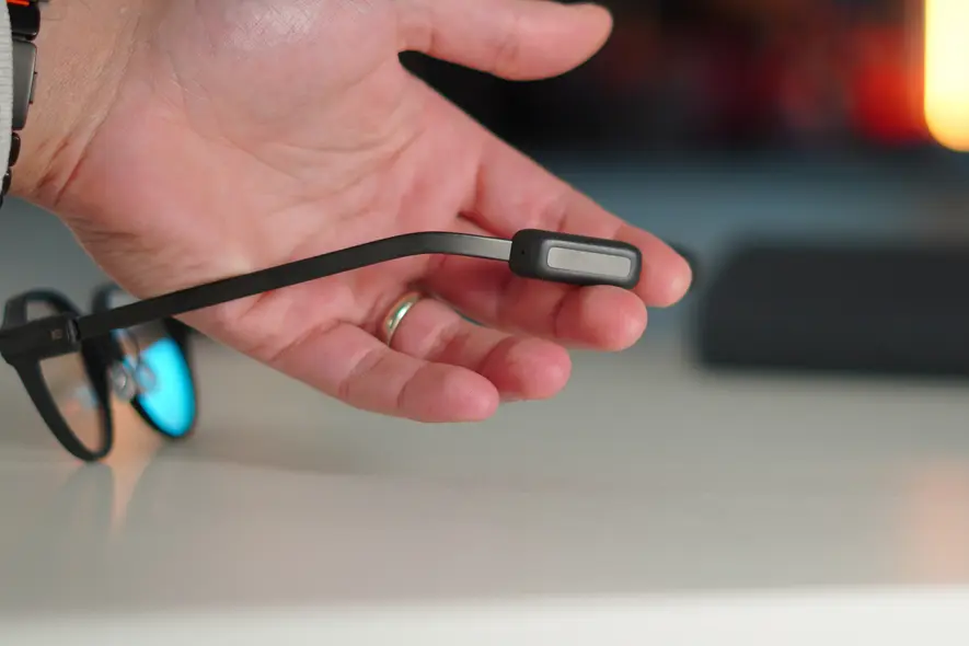 بزرگترین نگرانی من از نسخه جدید این بود که ممکن است طرح بیش از حد تغییر کند، چرا که طراحی G1 بخش مورد علاقهام بود. خوشحال شدم که دیدم آنها بیشتر طرح را حفظ کردهاند و علاوه بر این وزن را کمتر کردهاند؛ وزن جدید فقط ۳۶ گرم است؛ برای مقایسه، عینکهای Meta Ray‑Ban حدود ۵۰ گرم وزن دارند. بخش بالایی چارچوب لنز کمی صافتر شد که برایم مشکلی نبود. مهمترین تغییر، روش ورودی بر روی عینکها بود. در هر پایهٔ دوپایه، آنها نقطه لمسی که قبلاً رضایت‑بخش نبود را با یک سیستم کنترل صفحه لمسی پیشرفته اما آسان جایگزین کردند. این حس دکمهٔ کنترل دوربین در iPhoneهای مدرن را میآورد. میتوانید با کشیدن، لغزاندن، اسکرول، ضربهٔ تک، ضربهٔ دوگانه و نگهداشتن طولانی، با رابط کاربری و ویژگیها بهروشهای مختلف تعامل داشته باشید. این کنترل پشت گوش شما پنهان است، بنابراین برای اکثر افراد قابل مشاهده نیست.